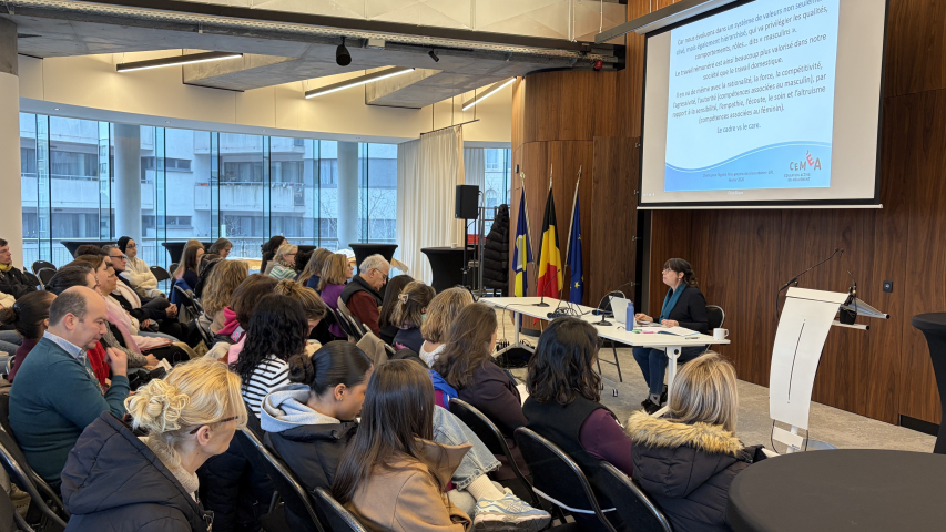 Après l’introduction de Mélina Vanden Borre (BPL), Marie‑France Zicot (CEMÉA) a présenté les stéréotypes de genre à l’œuvre la petite enfance et leurs impacts sur le développement des enfants.