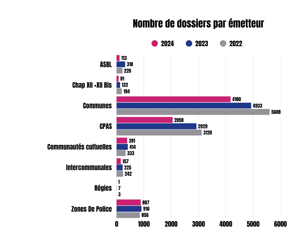 En 2024, 52 plaintes ont été reçues, un chiffre stable par rapport aux années précédentes, malgré une légère hausse. Un certain nombre de ces plaintes concernait l’organisation des élections communales (liste des électeurs, affichage électoral, utilisation de locaux communaux à des fins partisanes, etc.). D’autres problématiques récurrentes ont porté sur : le non-respect des droits des conseillers communaux, l’absence de points à l’ordre du jour, le non-respect des délais de convocation, le non-respect du scrutin secret, l’usage partisan des canaux officiels, ou encore le non-respect de la législation communale et de la LO CPAS.